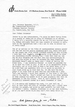 Through a friendship that developed with Fr. Irenaeus Herscher, then Director of the Library at St. Bonaventure University and prominently mentioned in The Seven Storey Mountain, Naomi Burton Stone gave her papers to the University to add to the Merton materials that Fr. Irenaeus had already begun collecting.