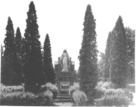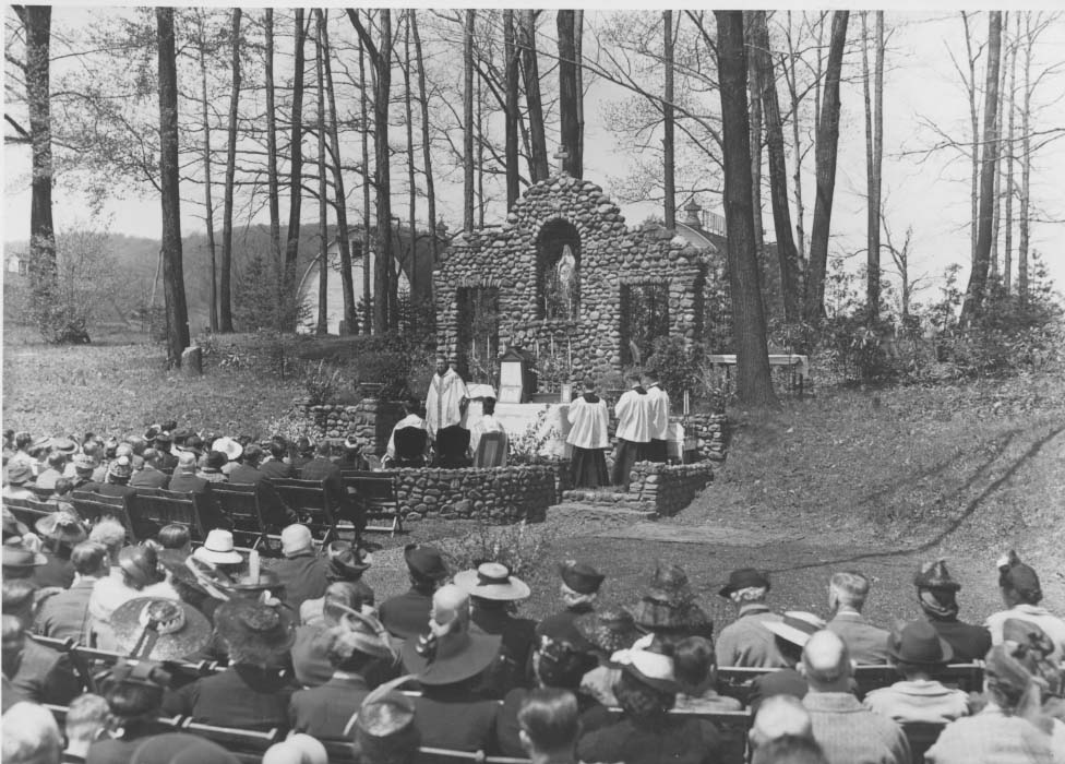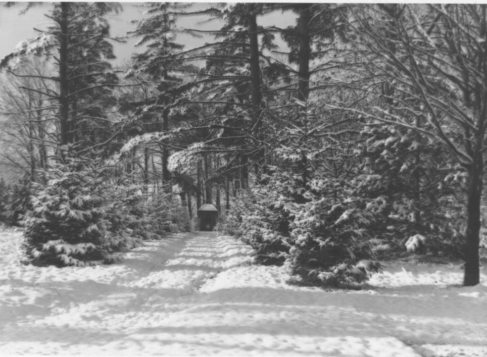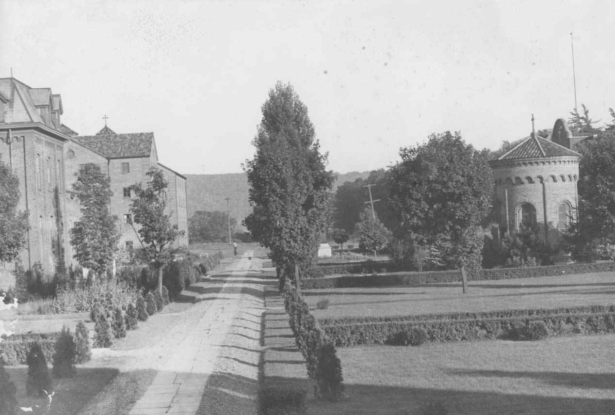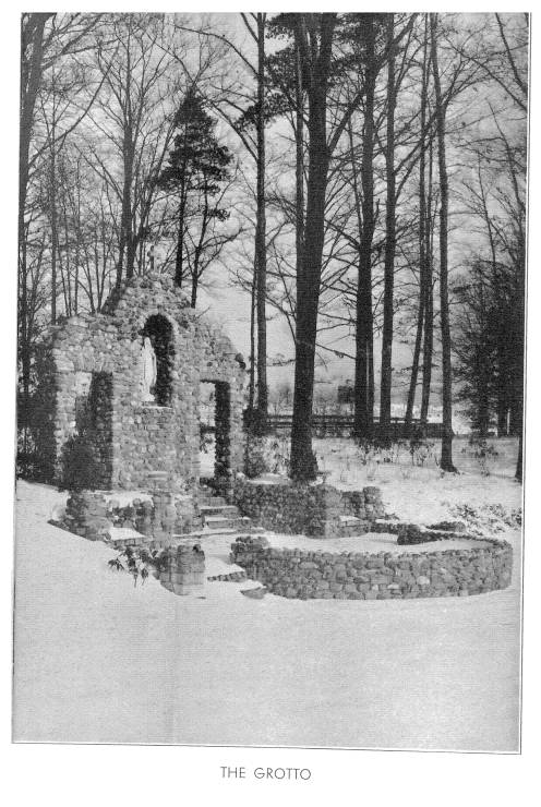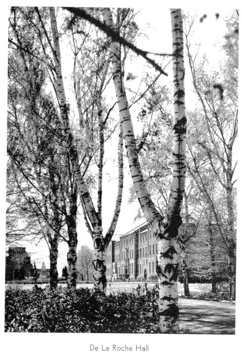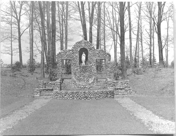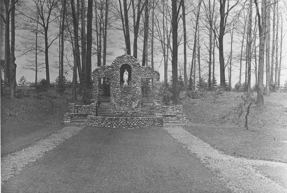 To the south of De la Roche and Alumni Halls lay a pathway that led to a small shrine dedicated to St. Therese of Lisieux. Just beyond this shrine there was a grove of trees and a grotto dedicated to the Blessed Virgin Mary. To the west and south of these sites were the McGraw-Jennings Athletic Fields. Beyond all these to the south lay the line of trees that marked the path of the Allegheny River. There was a railroad bridge nearby spanning the river which allowed people to venture over to the hills and valleys on the other side.